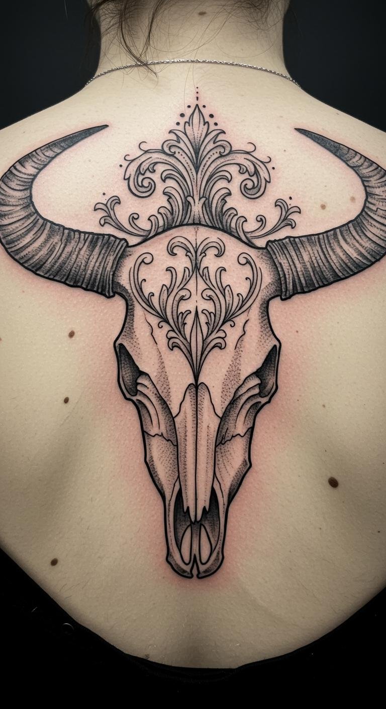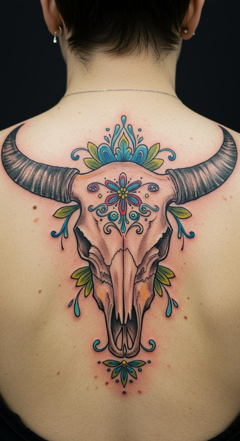 This cow skull tattoo, positioned on the upper back, serves as a powerful reminder of life’s duality, representing both strength and the cycle of existence.