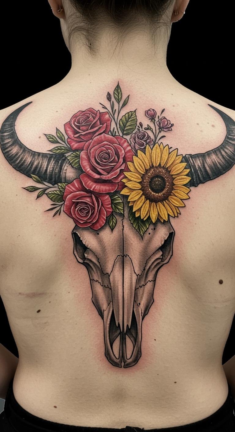 This tattoo embodies the duality of life and death, with the cow skull symbolizing mortality and the roses and sunflowers representing the beauty and vibrancy of life.