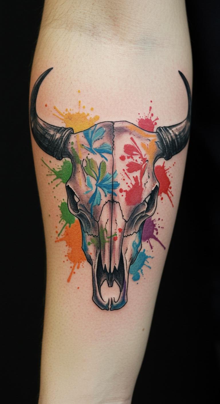 The cow skull tattoo symbolizes the balance of life and death, representing resilience and the cycle of nature.