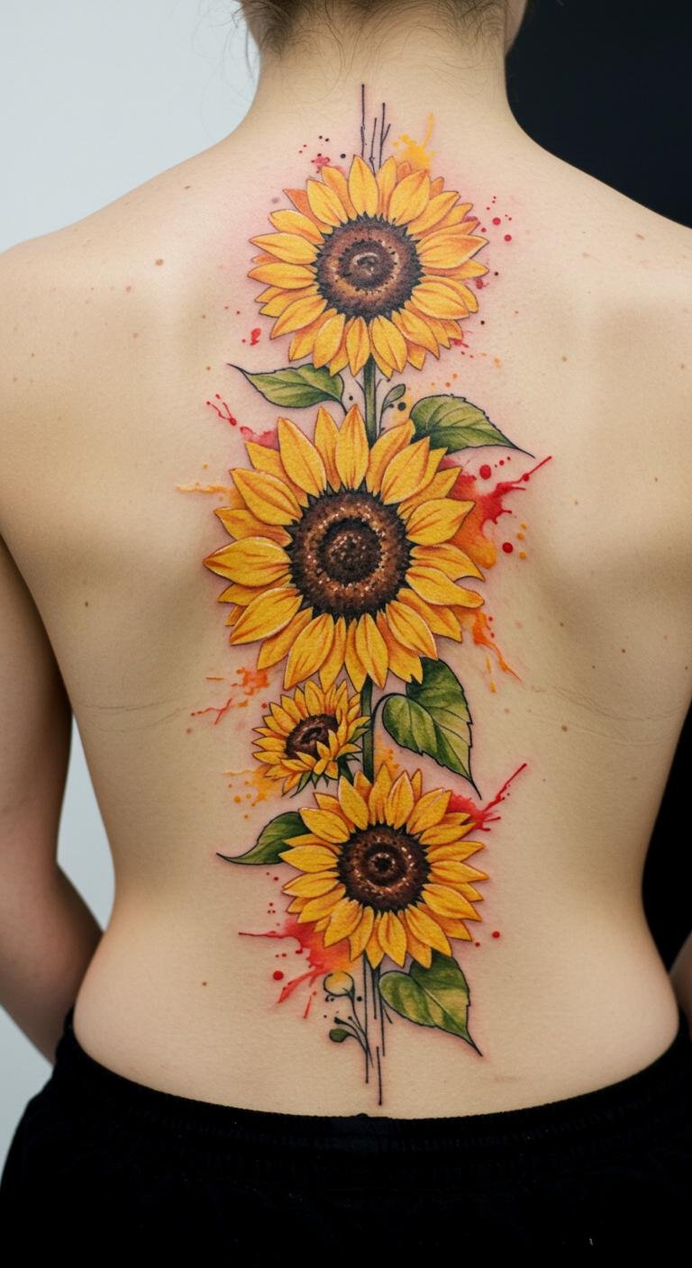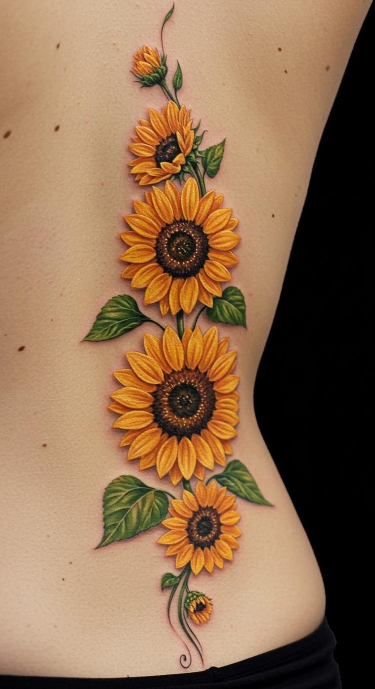 Sunflowers symbolize happiness and loyalty, making them a perfect choice for a spine tattoo.