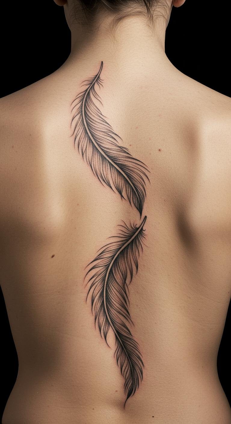 The feather spine tattoo symbolizes freedom, adventure, and the lightness of being.