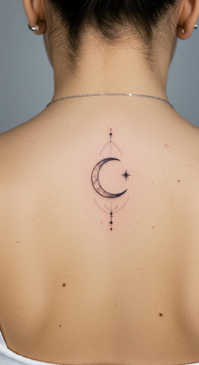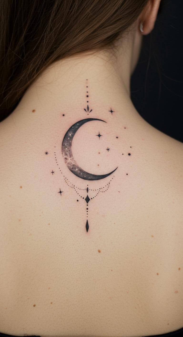The crescent moon spine tattoo embodies the enchanting essence of the night, symbolizing feminine energy and the mysteries of the cosmos.