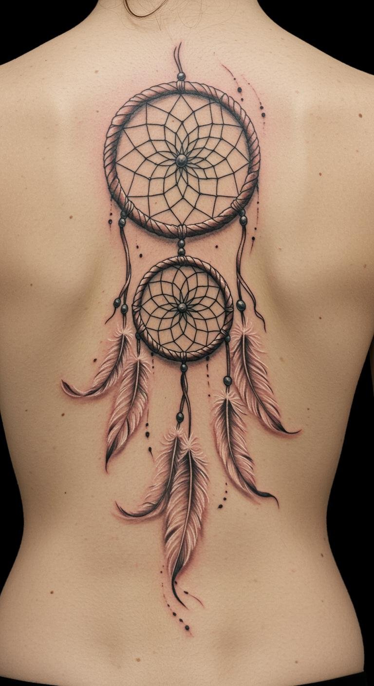 This dreamcatcher spine tattoo weaves together beauty and symbolism, capturing the essence of protection and positivity. Its intricate web design invites good dreams while warding off negativity, serving as a constant reminder of the freedom to chase dreams.