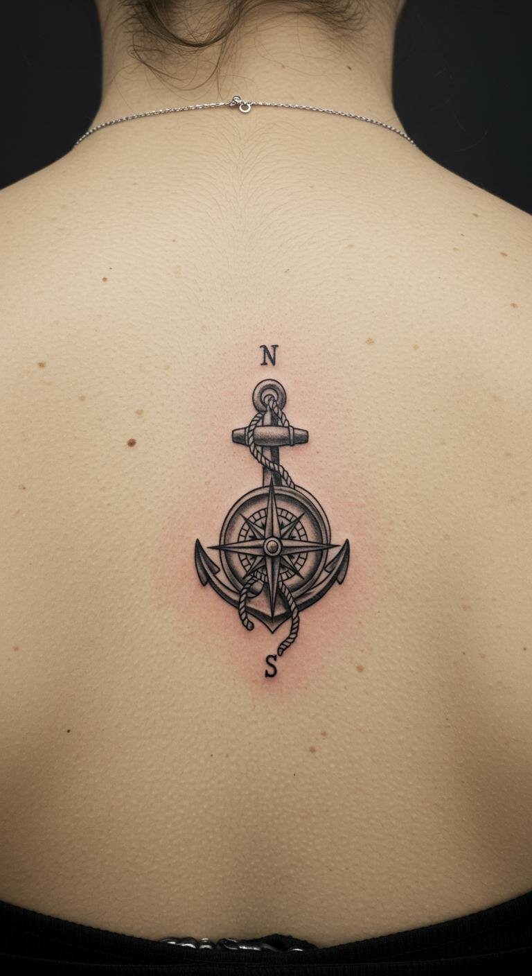 This Small Anchor With Compass Spine Tattoo symbolizes the balance between stability and exploration. The anchor represents grounding and security, while the compass signifies guidance and adventure.