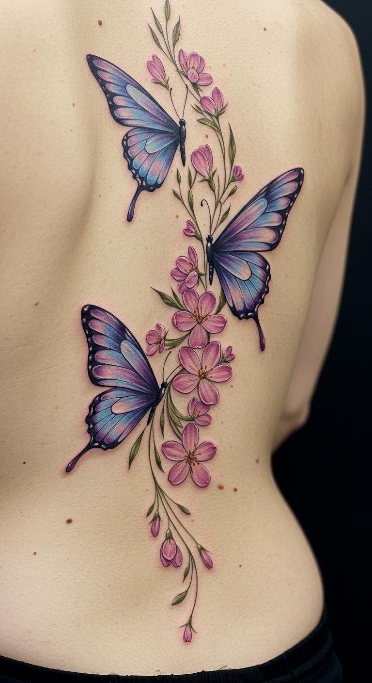 Positioned along the spine, this tattoo not only serves as a stunning visual but also embodies a sense of freedom and romance.