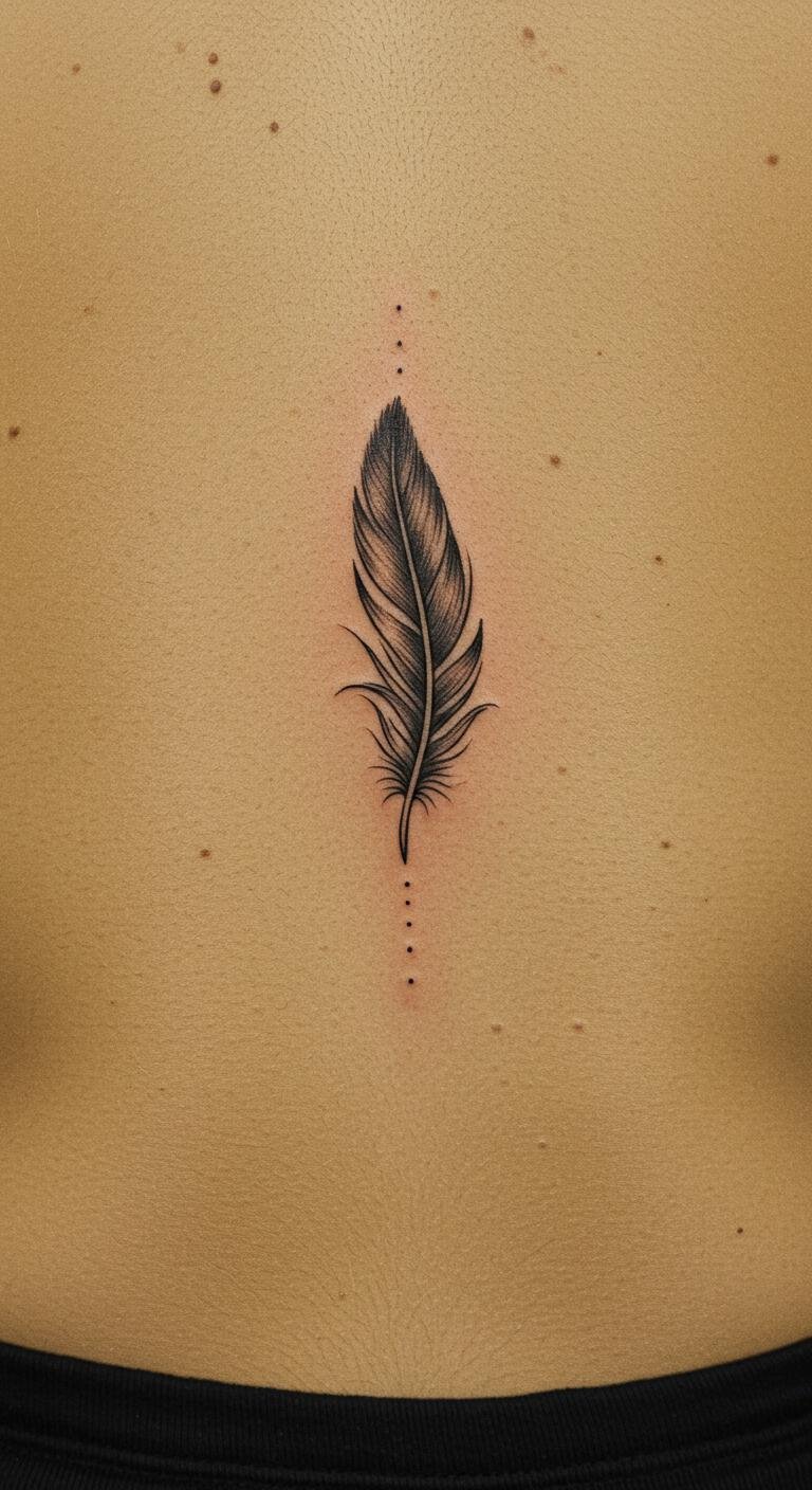 The tiny feather spine tattoo symbolizes liberation and freedom, echoing the wearer’s adventurous spirit.