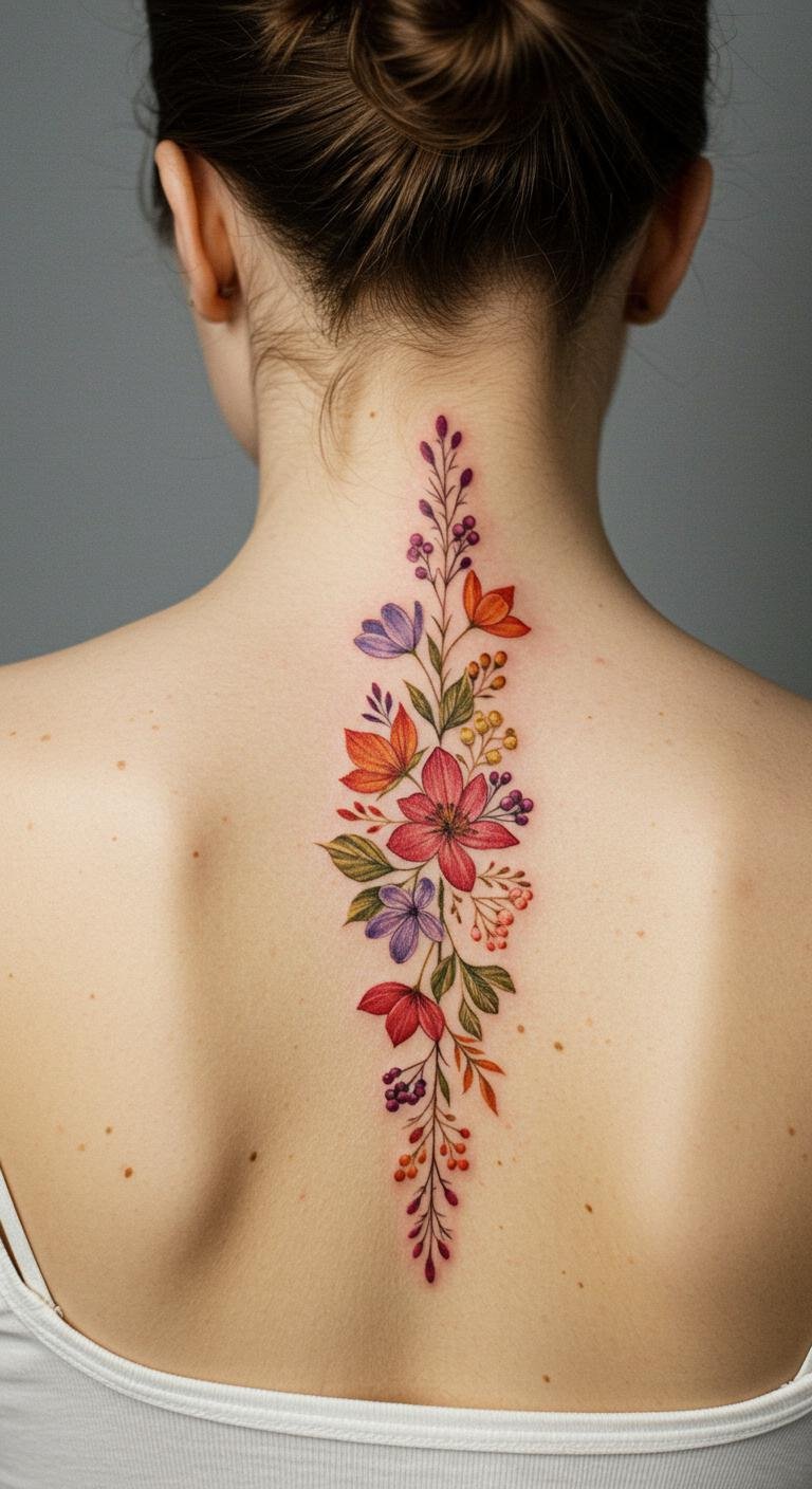 The placement along the spine not only emphasizes the beauty of the flowers but also highlights the wearer’s individuality and connection to nature.