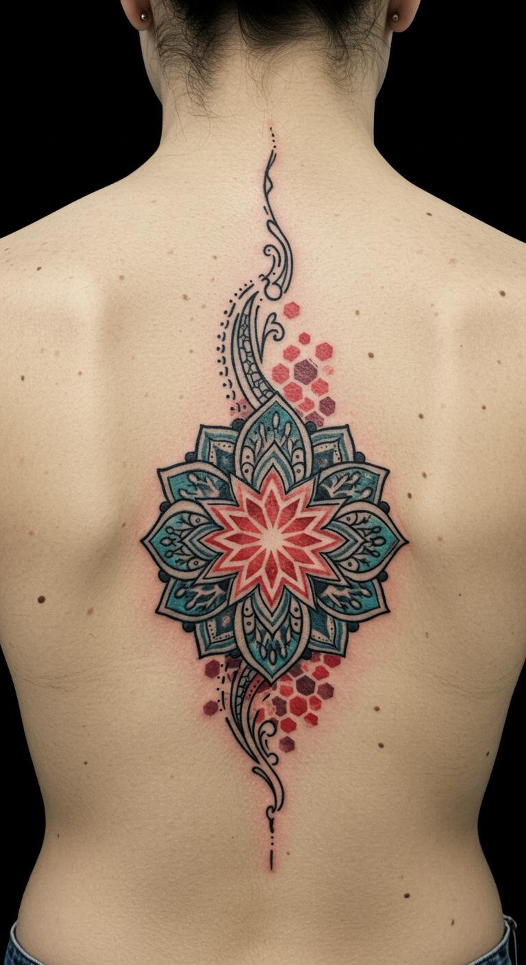This mandala spine tattoo symbolizes harmony and balance, embodying the essence of free-spiritedness.