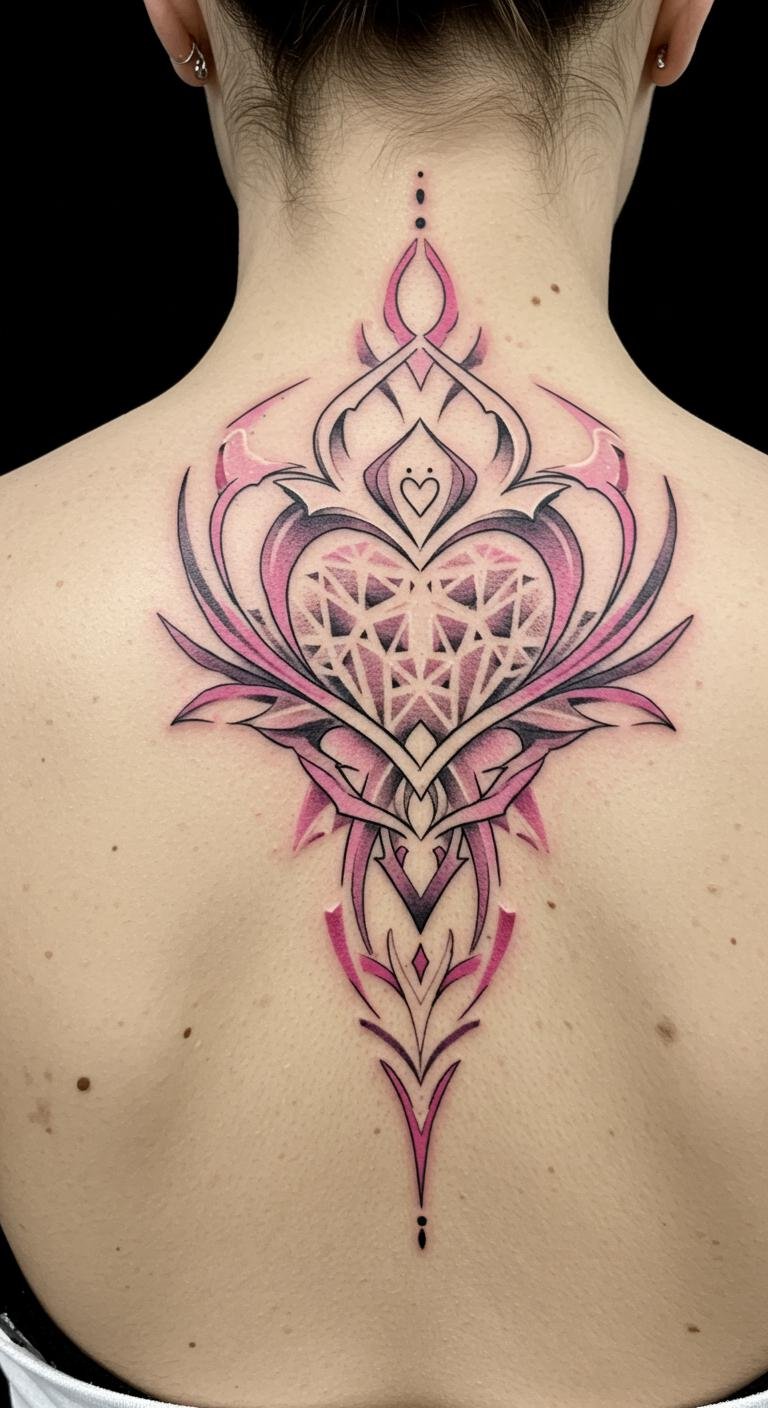 This Geometric Heart Spine Tattoo symbolizes the balance between strength and romance, reflecting the wearer’s unique spirit.