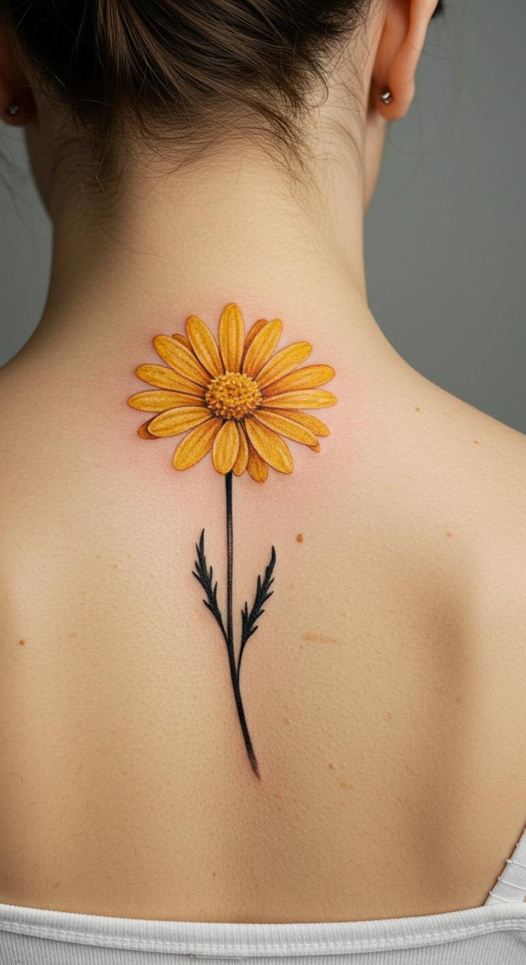 This daisy tattoo on the spine serves as a powerful emblem of renewal and positivity.