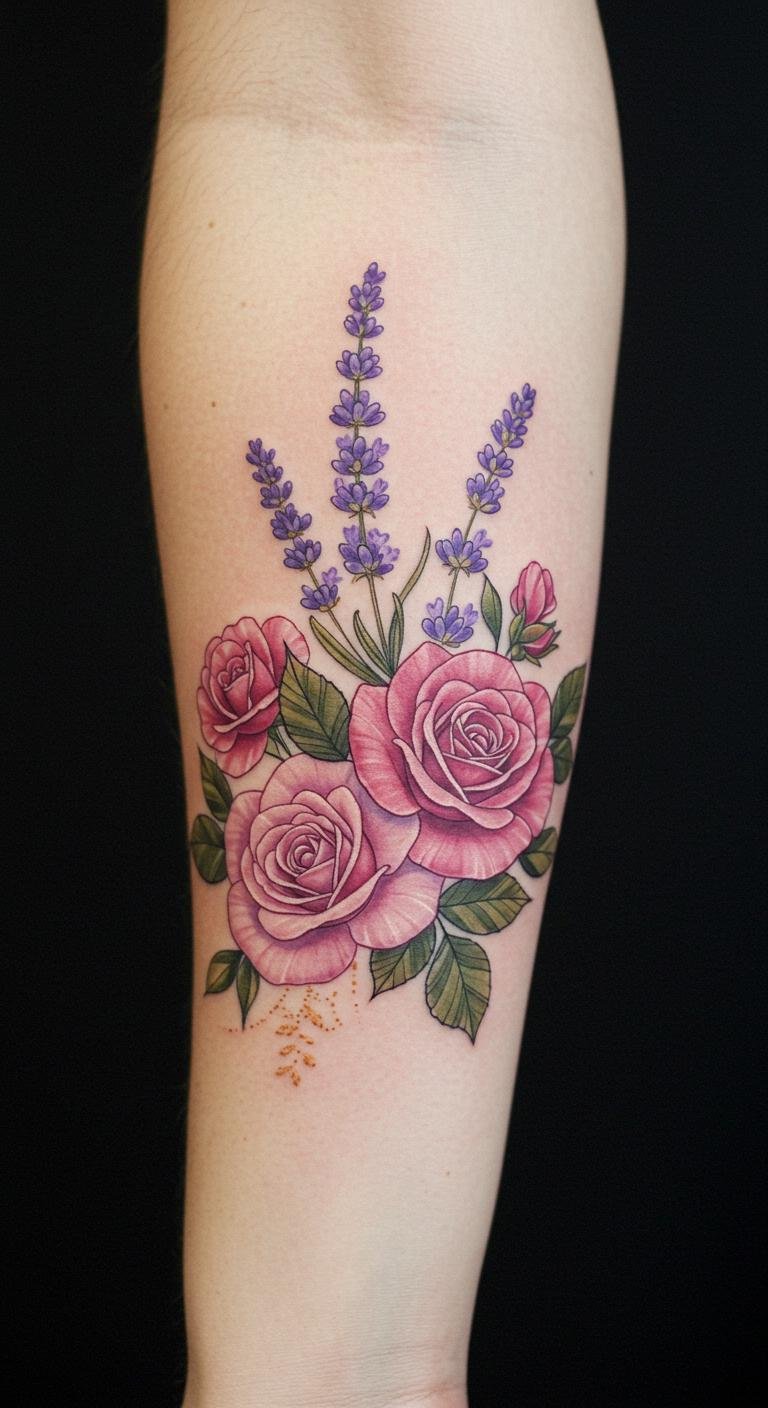 This design beautifully symbolizes love and tranquility, with the roses representing passion and the lavender embodying calmness.