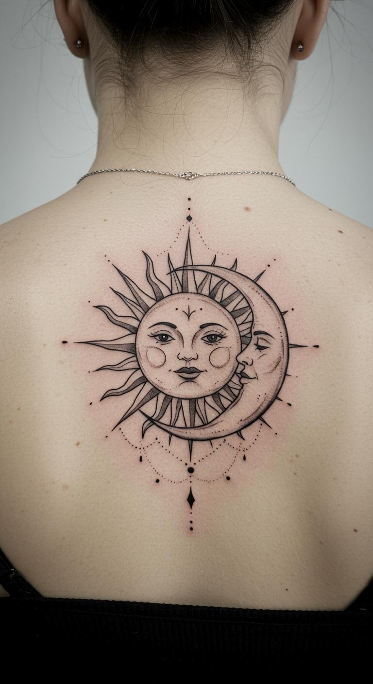 The Sun and Moon Fine Line Back Tattoo represents the eternal dance of light and darkness, symbolizing the coexistence of day and night.