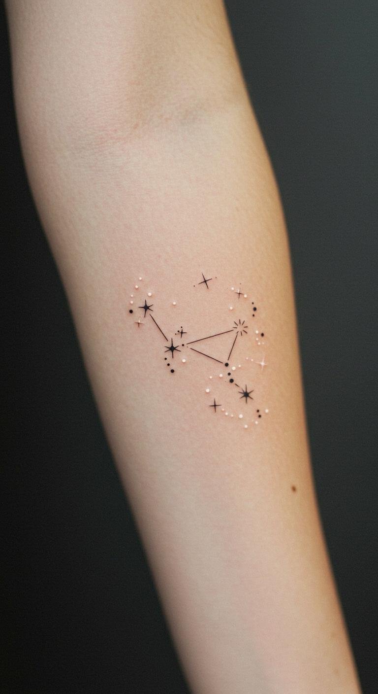 The delicate nature of the fine line work evokes elegance, while the constellation represents personal beliefs and stories, making it a unique piece of cosmic art that resonates with the wearer’s spirit.