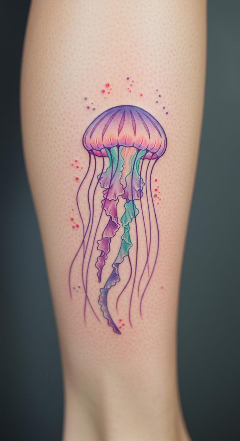 Its placement on the calf not only highlights the fluidity of the jellyfish’s movement but also celebrates a personal connection to the enchanting wonders of the sea.