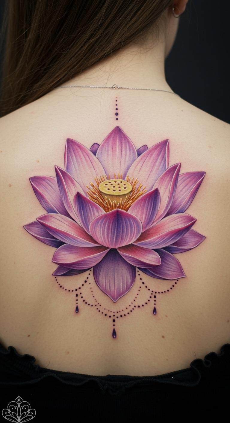 This exquisite tattoo embodies the lotus symbolism of purity and enlightenment, making it a profound statement piece.