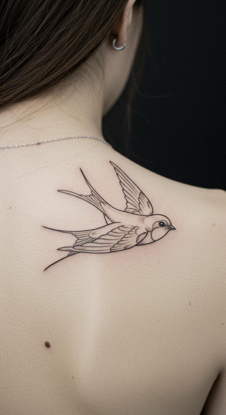 This tattoo embodies the spirit of freedom and grace, symbolizing hope and new beginnings through the graceful form of the swallow bird.