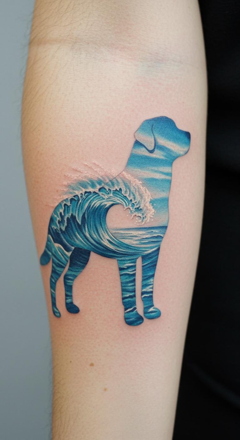 The ocean waves within the silhouette represent the journey of life shared with the dog, reflecting both joy and loyalty.
