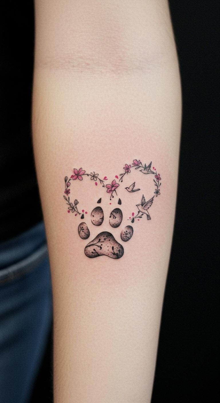 The paw print signifies the imprint your furry friend has left on your heart, while the birds reflect the spirit of companionship and the joy they bring.