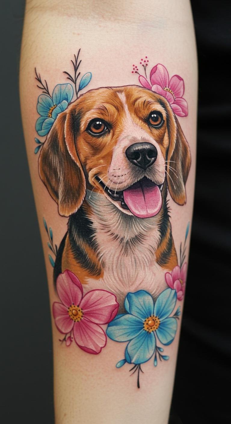 The vibrant colors and intricate details invite admiration, making it not just a tattoo, but a heartfelt tribute to the enduring connection with a beloved companion.