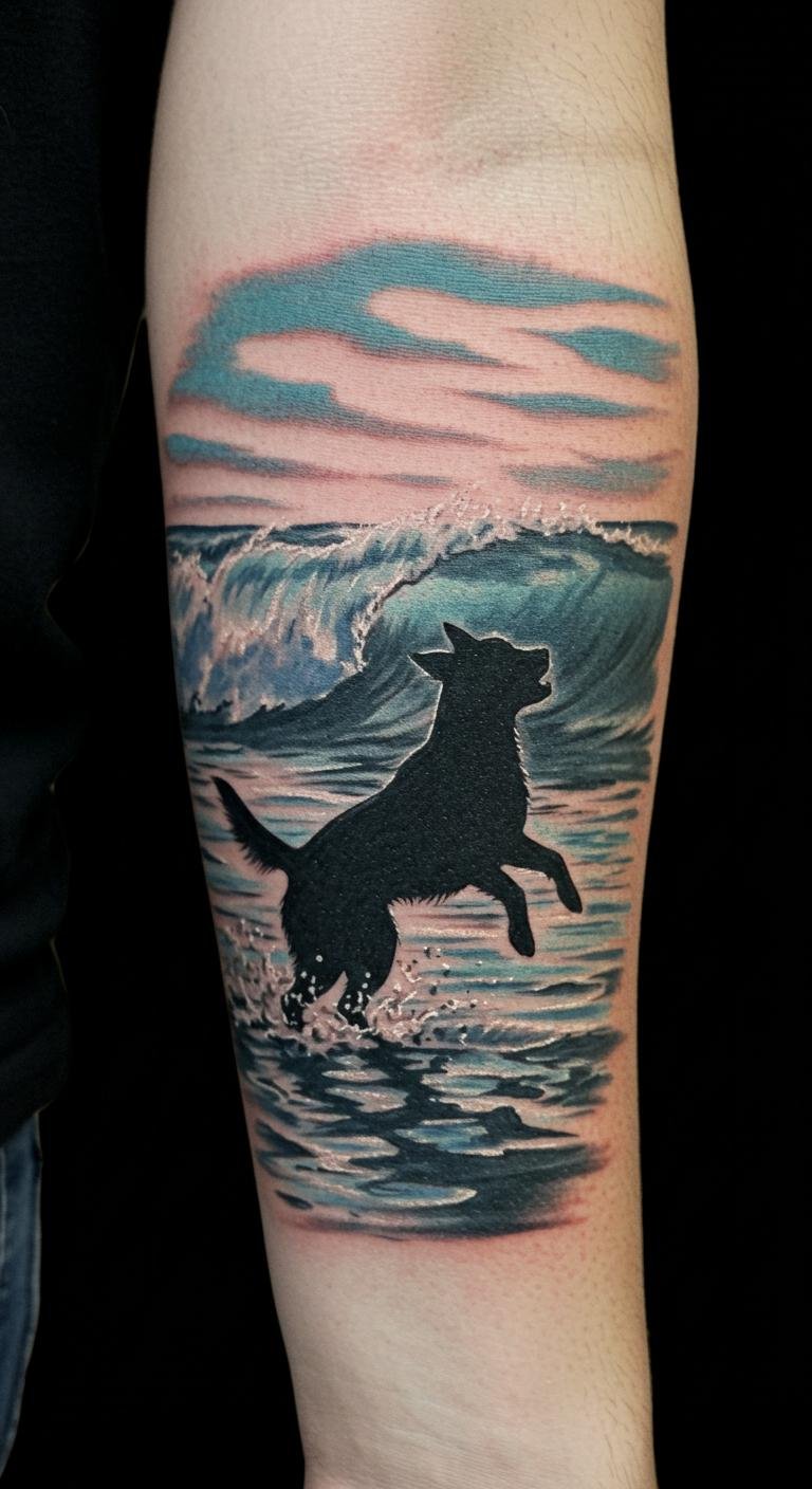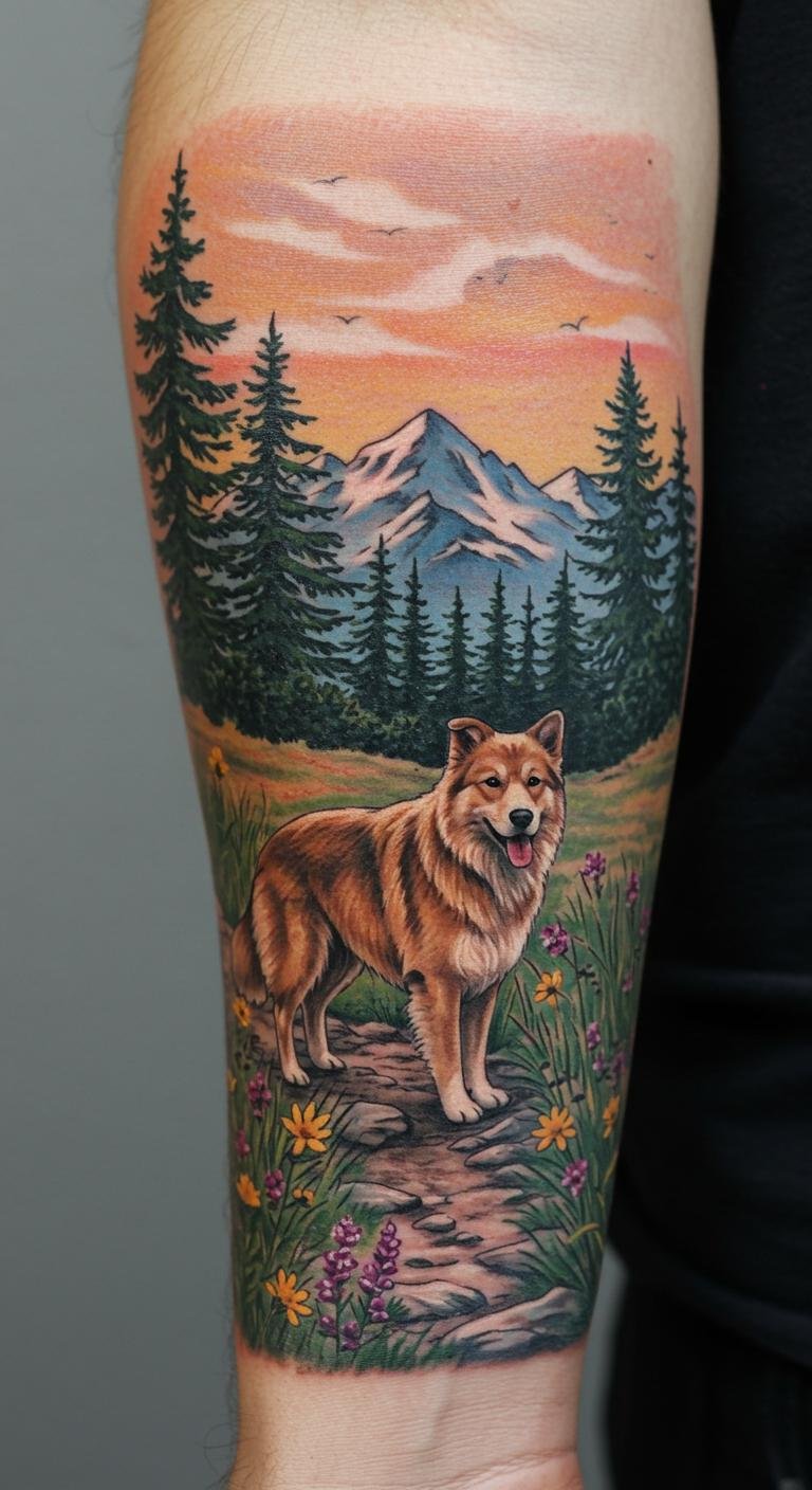 Placed on the forearm, it serves as a constant reminder of joyful moments spent exploring nature with a beloved pet, making it a personal and meaningful piece that resonates with the spirit of freedom and loyalty.
