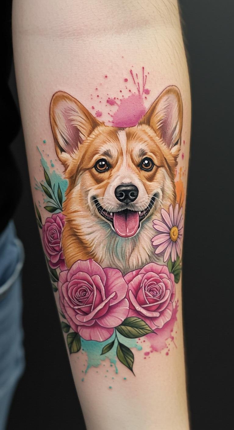 This tattoo symbolizes joy and affection, capturing the lively spirit of corgis while integrating the beauty of nature with the floral elements.