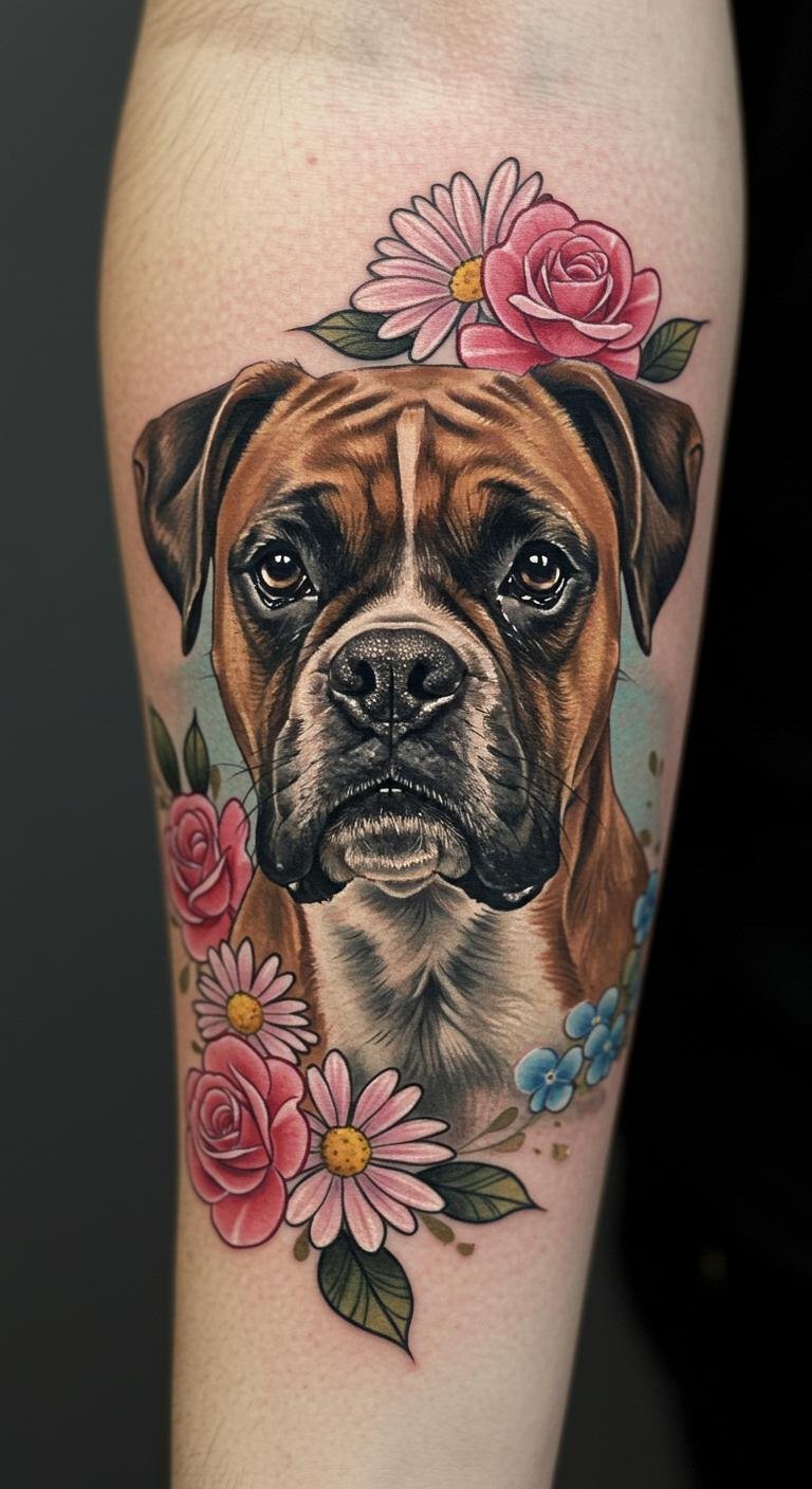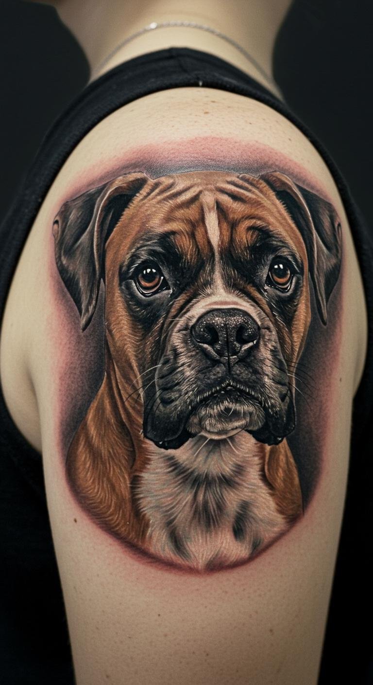 The Boxer tattoo symbolizes loyalty, strength, and a playful spirit, reflecting the breed’s loving nature.