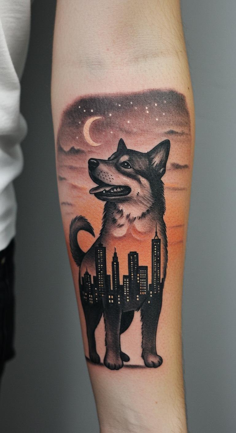 This tattoo symbolizes the bond between a dog and its owner, representing loyalty and companionship against the backdrop of a bustling urban life.