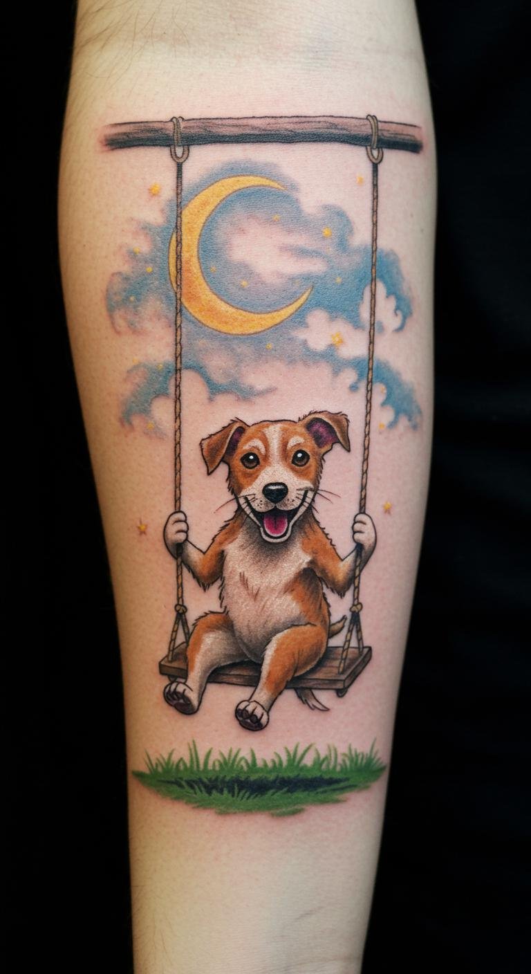 This tattoo symbolizes the joyful bond shared between a dog and its owner, capturing the essence of companionship and love.