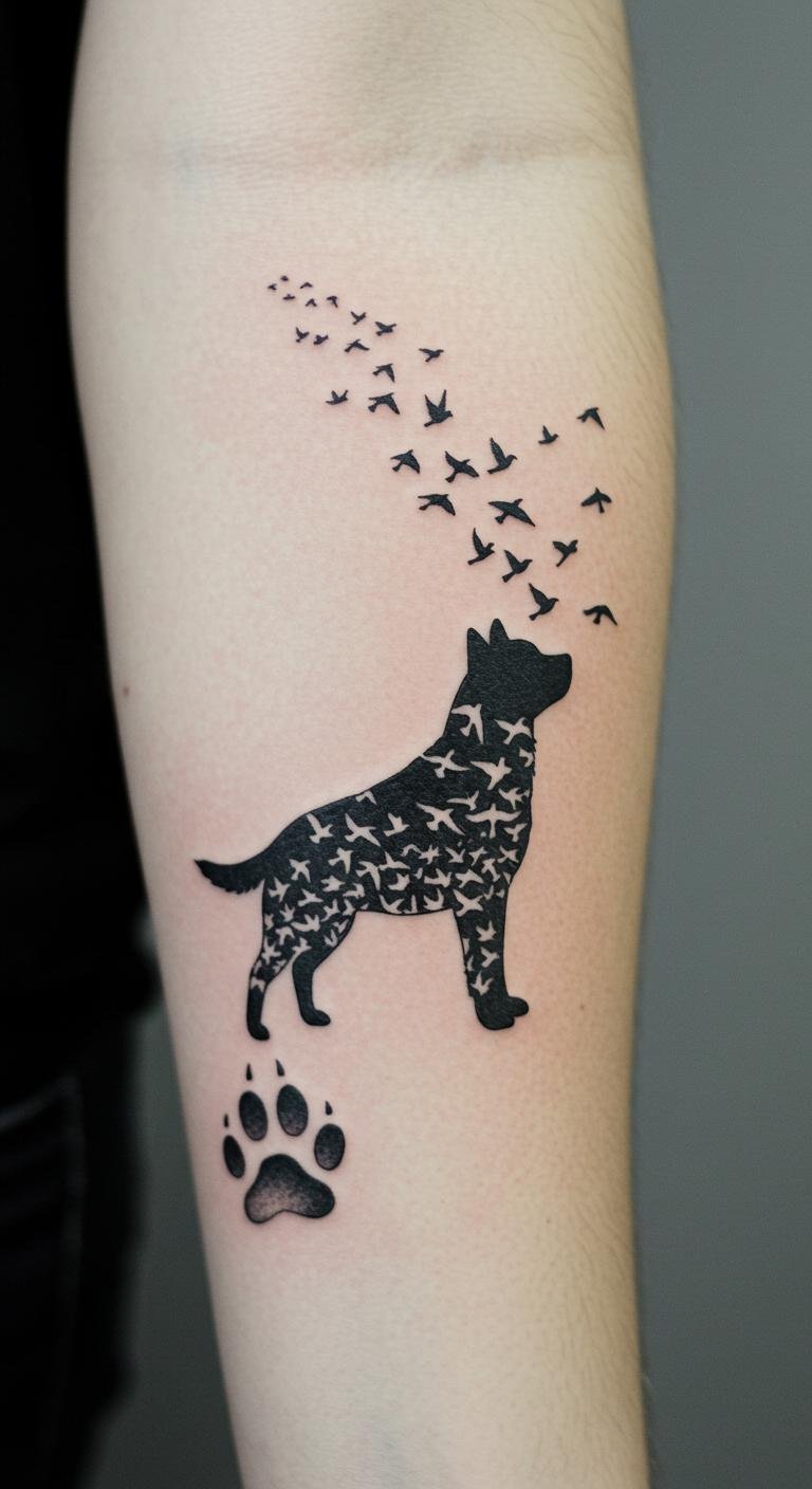 This tattoo design captures the essence of companionship and loyalty through the silhouette of a dog, symbolizing the unbreakable bond between pet and owner.