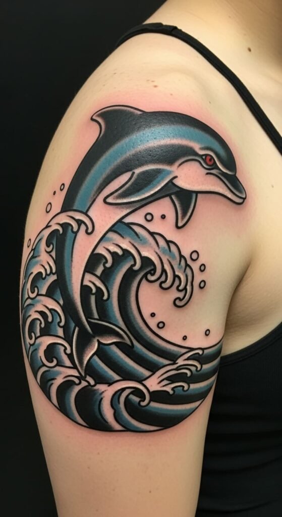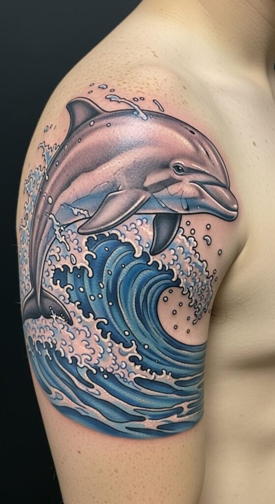 Realistic Dolphin Riding a Wave Shoulder Tattoo