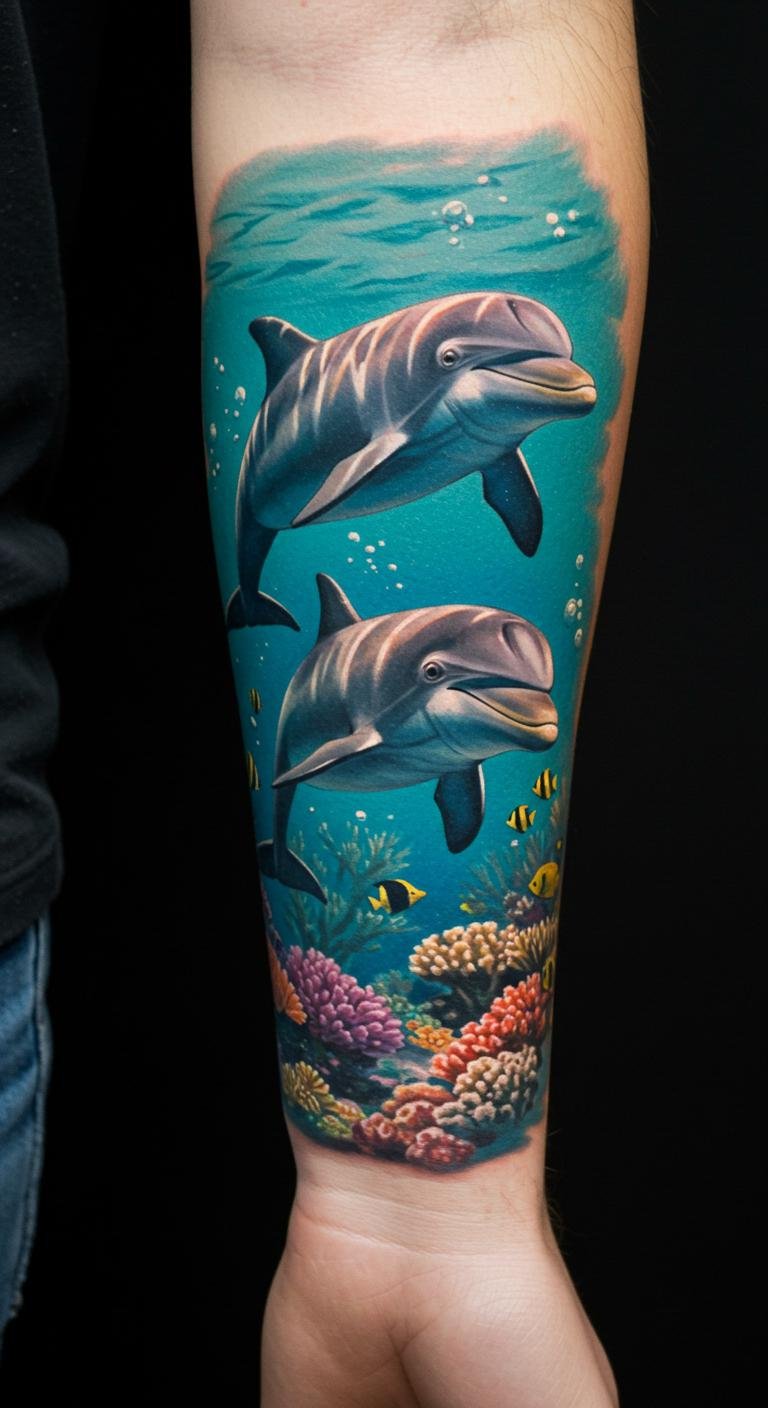 This tattoo symbolizes freedom, joy, and the beauty of marine life, inviting a deep connection with the ocean.