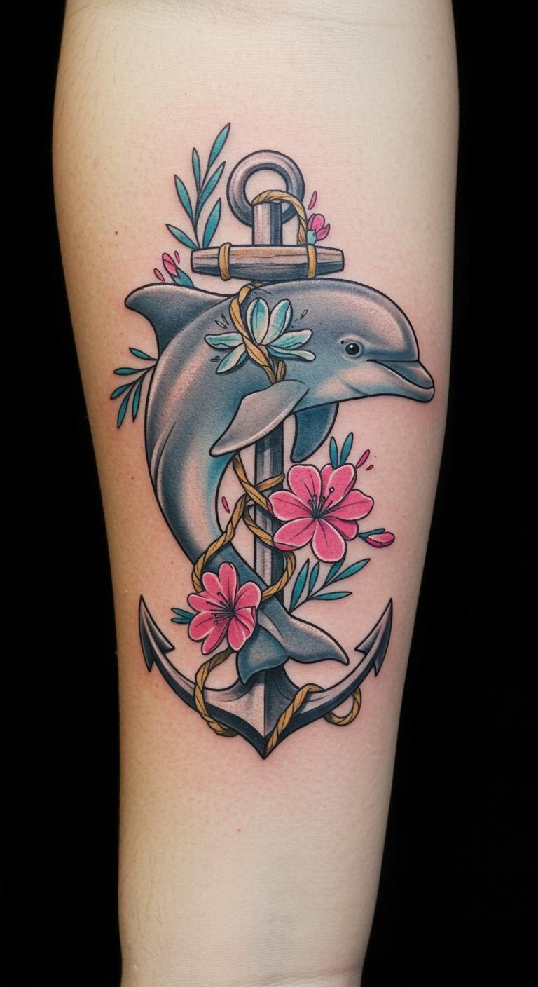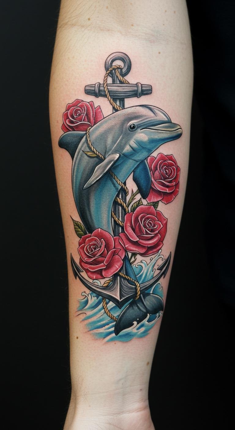 This tattoo design symbolizes the harmony between freedom and stability, represented by the dolphin and anchor, while the roses add a touch of elegance and emotional depth.
