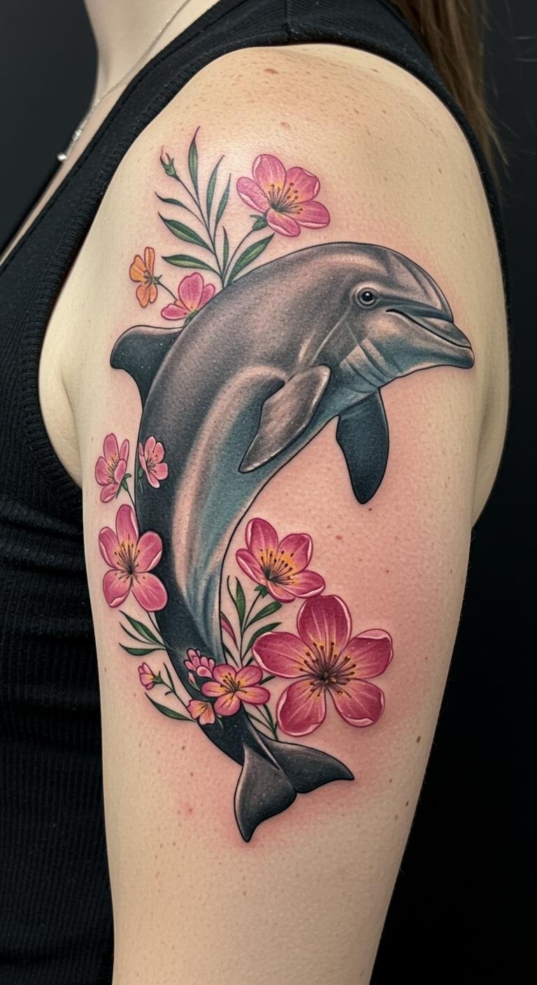 This tattoo symbolizes the harmony between the playful spirit of dolphins and the beauty of nature through flowers, representing growth and femininity.