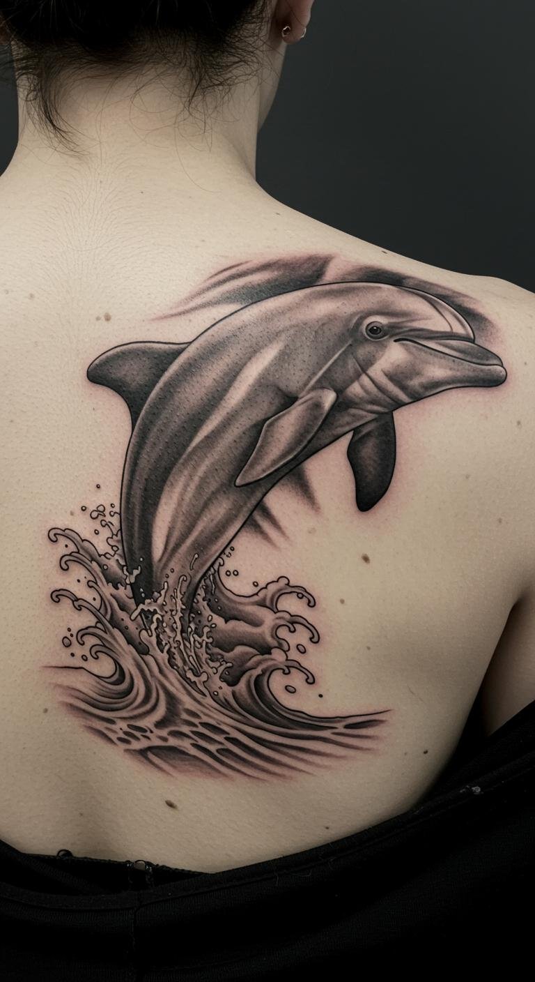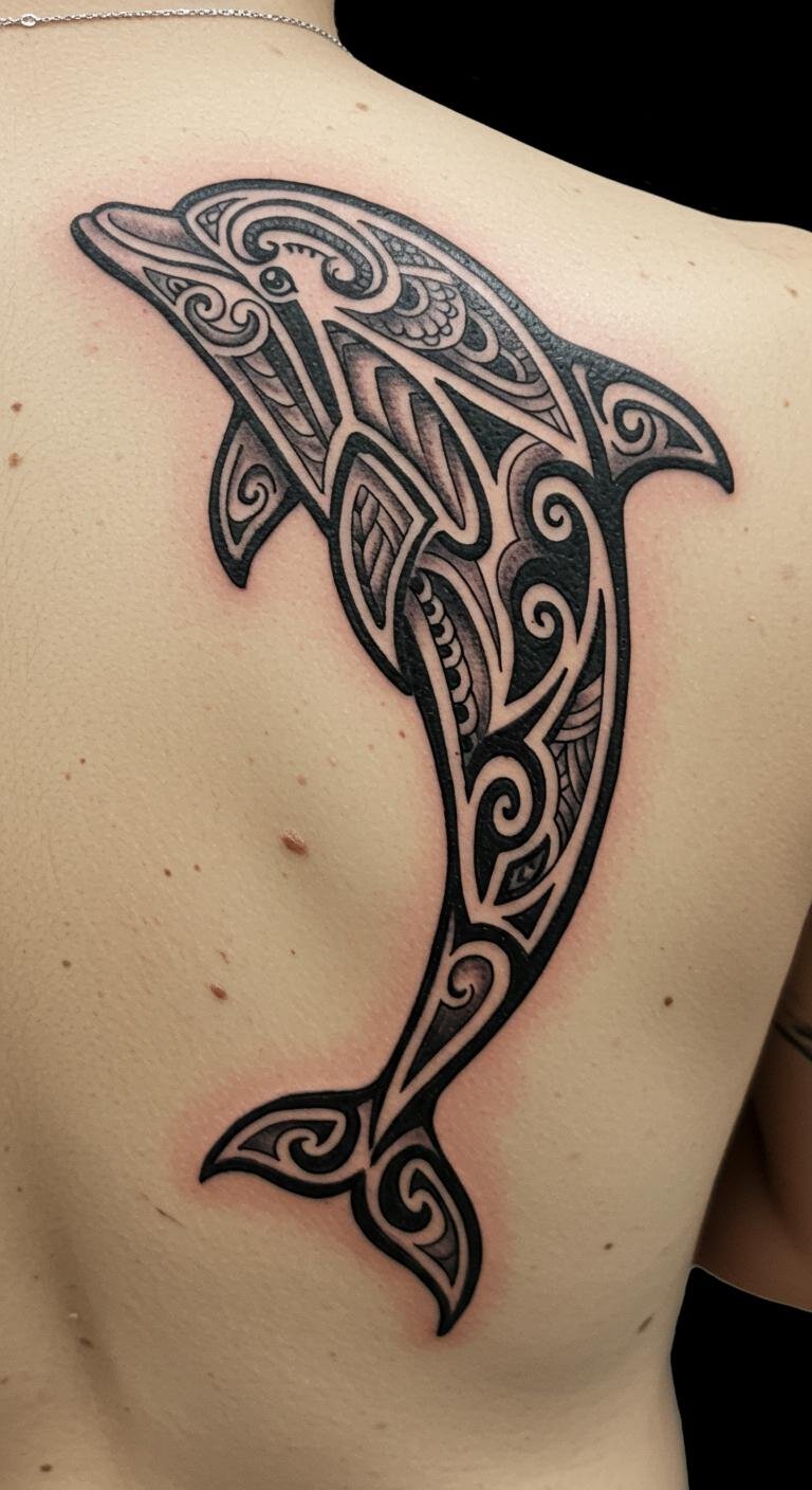 Positioned on the upper back, it symbolizes freedom and a deep connection to nature. The intricate patterns evoke a sense of movement and fluidity, mirroring the dolphin’s grace in water.