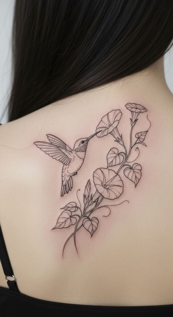Fine Line Hummingbird With Morning Glory Tattoo