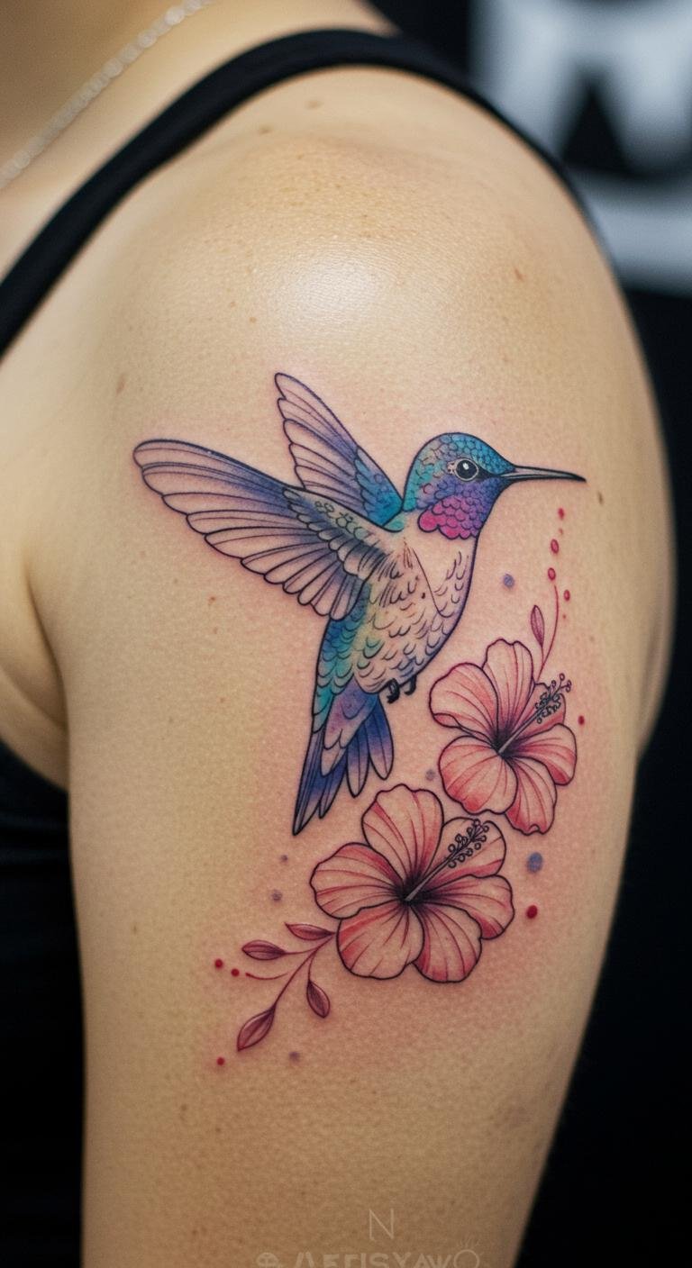 The hummingbird symbolizes joy, love, and the beauty of life, making this tattoo a heartfelt expression of individuality and personal freedom.