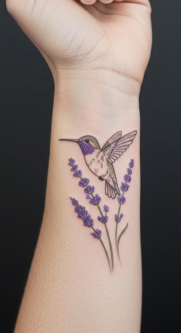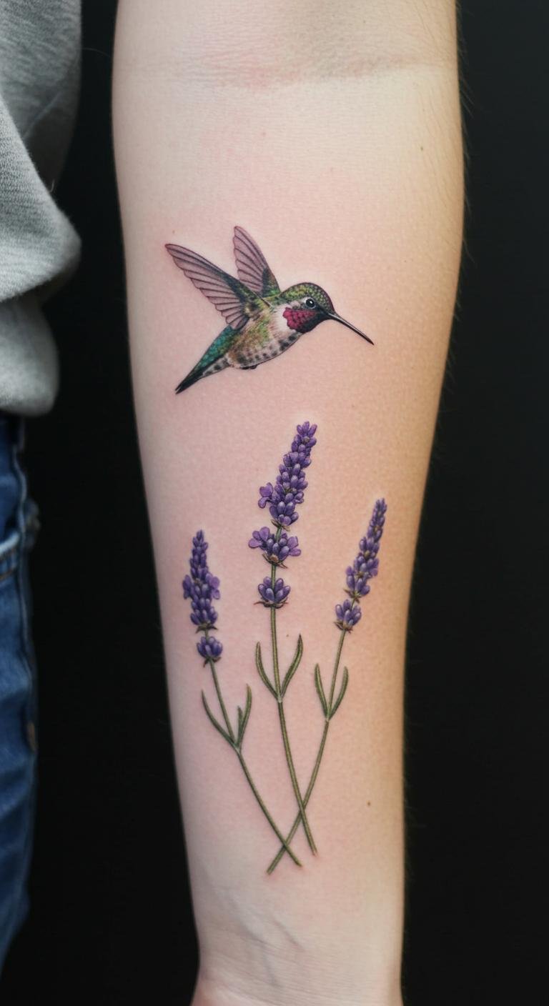 This exquisite tattoo design embodies joy and freedom, symbolized by the hummingbird and its gentle interaction with lavender.