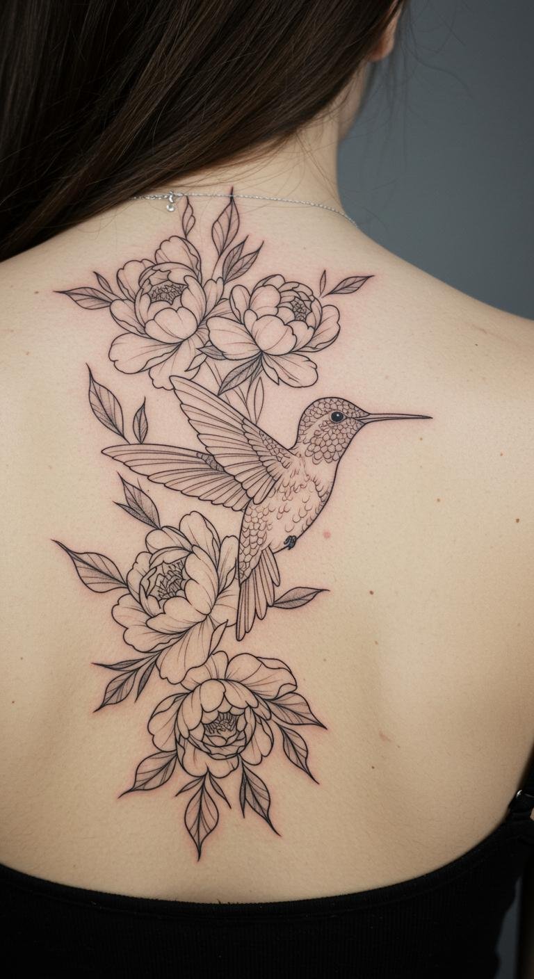Fine Line Hummingbird Back Tattoo