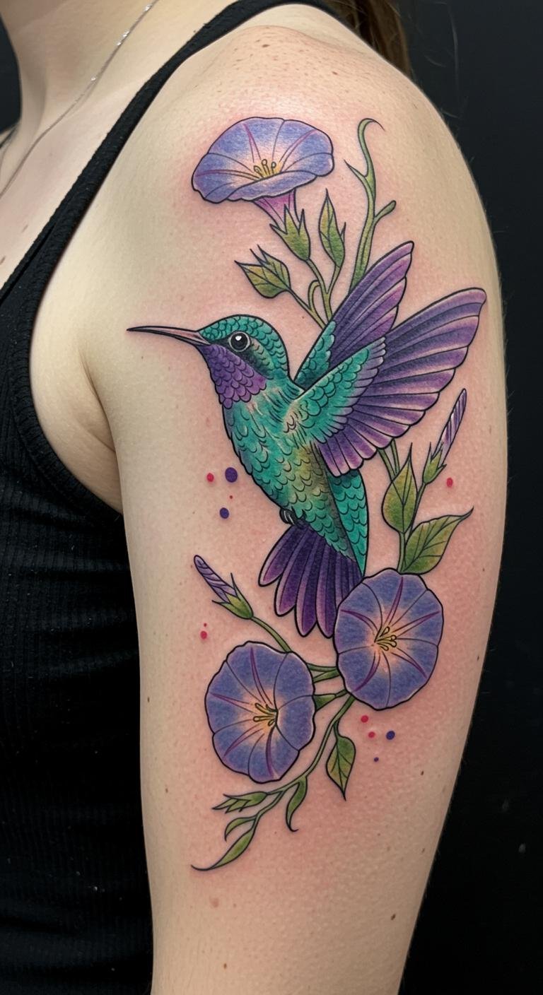 The hummingbird, a creature of lightness, alongside the vibrant morning glory, evokes a sense of vitality and connection to nature.