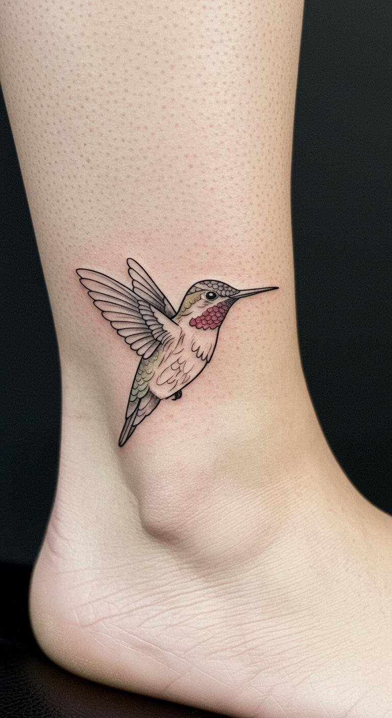 The hummingbird ankle tattoo symbolizes joy and freedom, embodying a sense of lightness and grace.