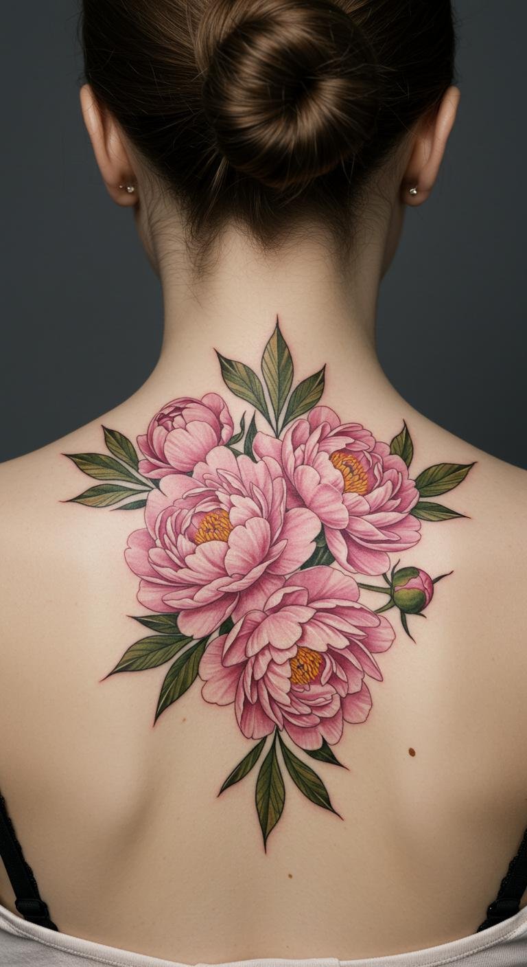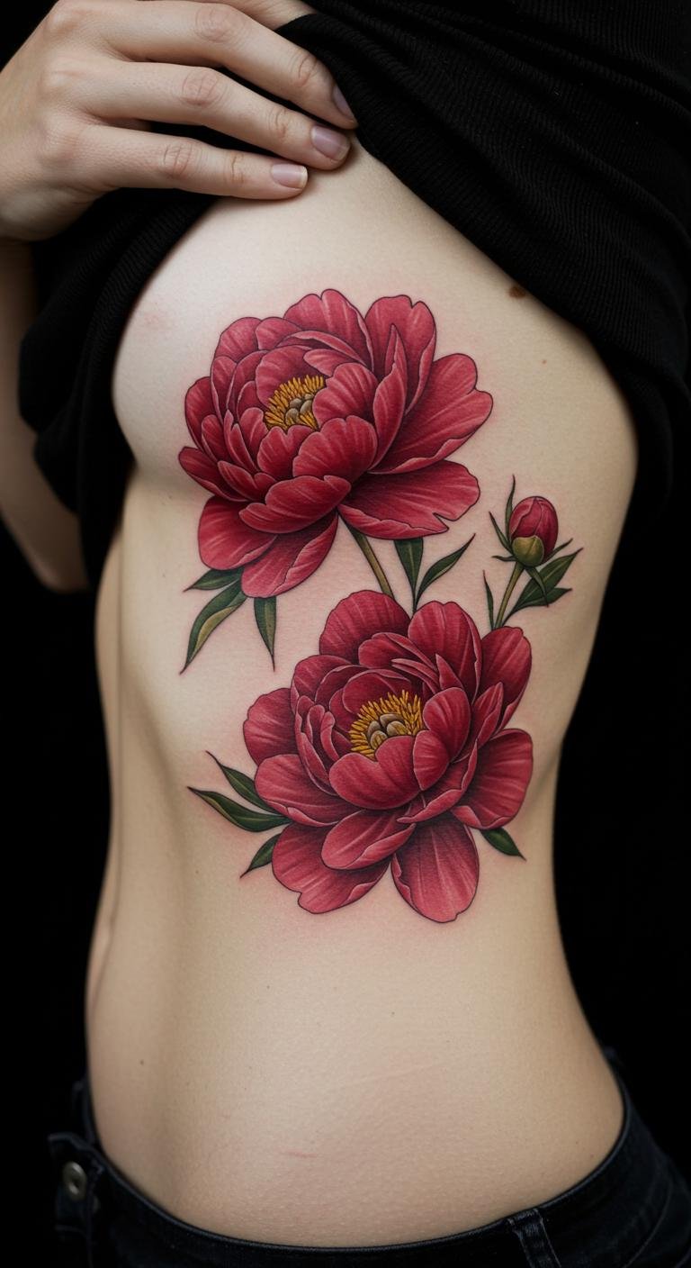 The vibrant red hues of the peonies not only bring life to the skin but also resonate with the wearer’s unique journey, celebrating strength and beauty in every bloom.