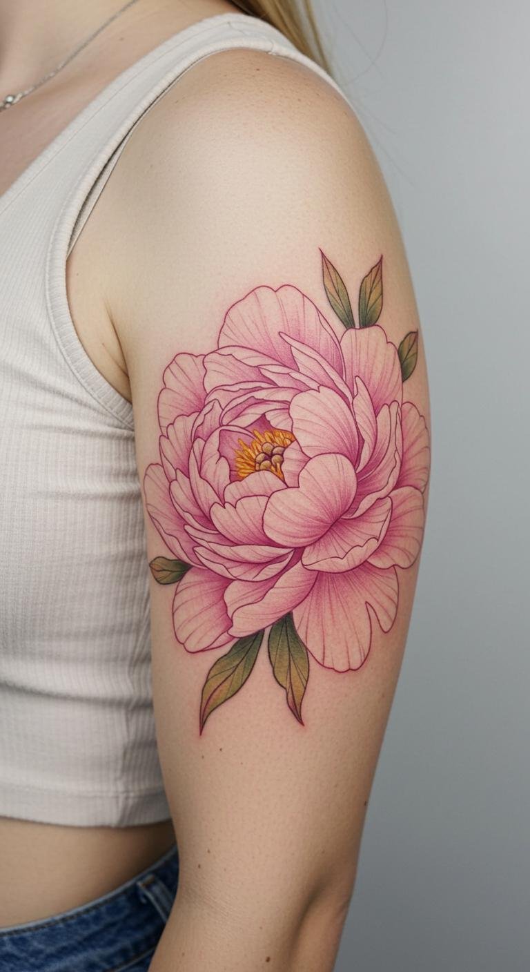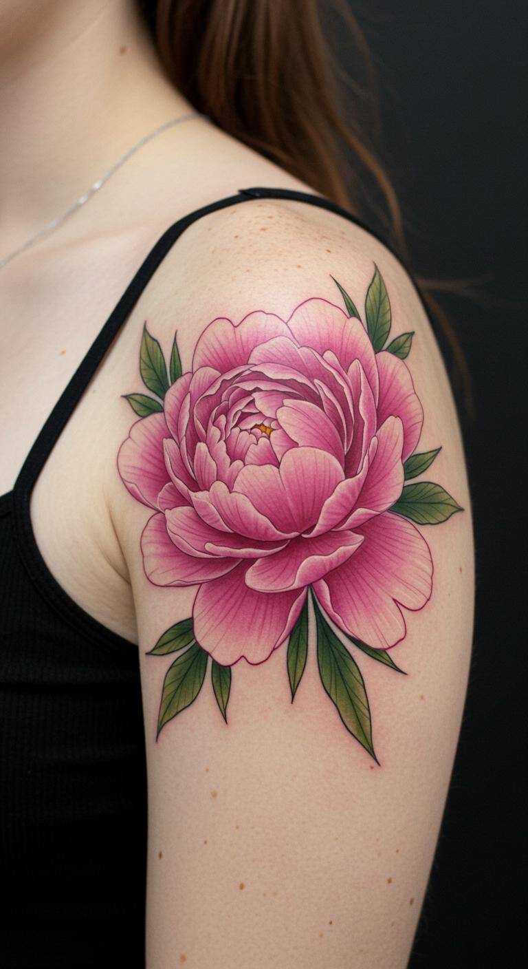 The Fine Line Colored Peony Shoulder Tattoo symbolizes strength and beauty, embodying the feminine spirit.