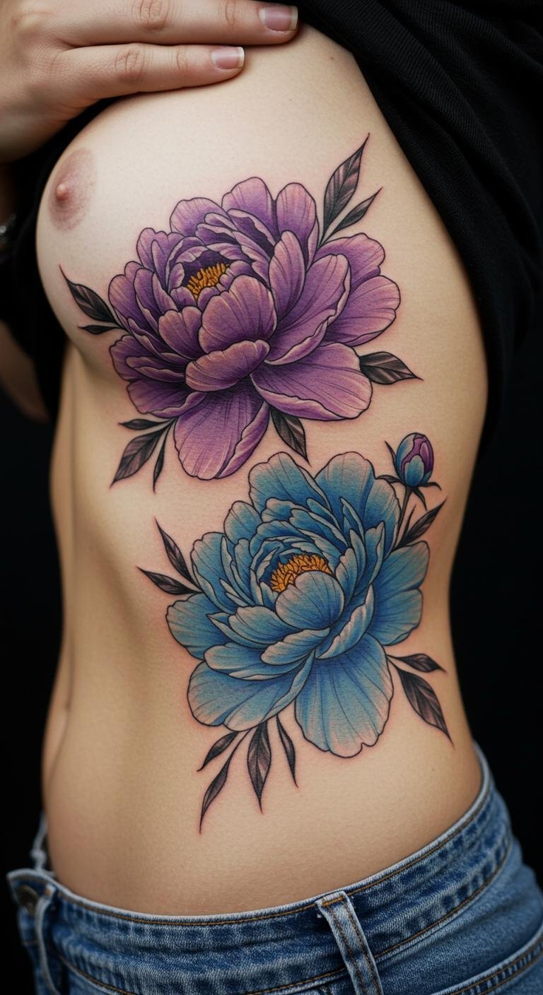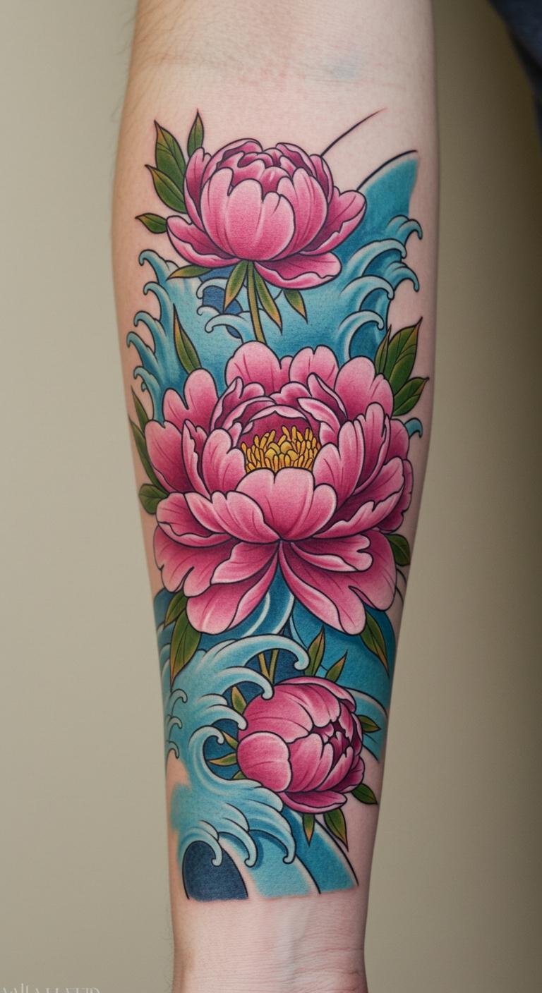 This tattoo symbolizes the harmonious balance between femininity and strength, with peonies representing beauty and prosperity, while the waves embody freedom and resilience.