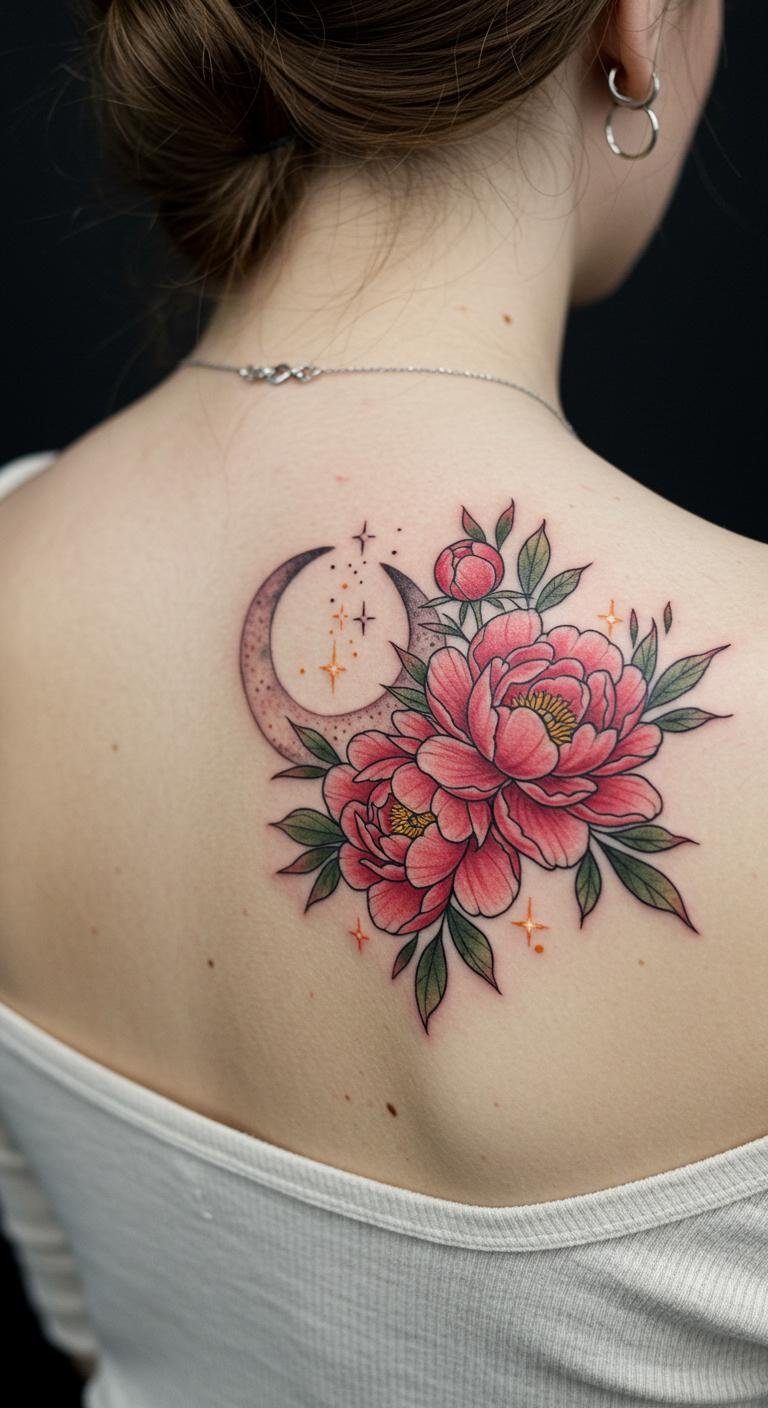 The vibrant peonies are a reminder of life’s fleeting beauty, while the crescent moon and stars signify dreams and aspirations, creating a harmonious blend of floral artistry and celestial elements.