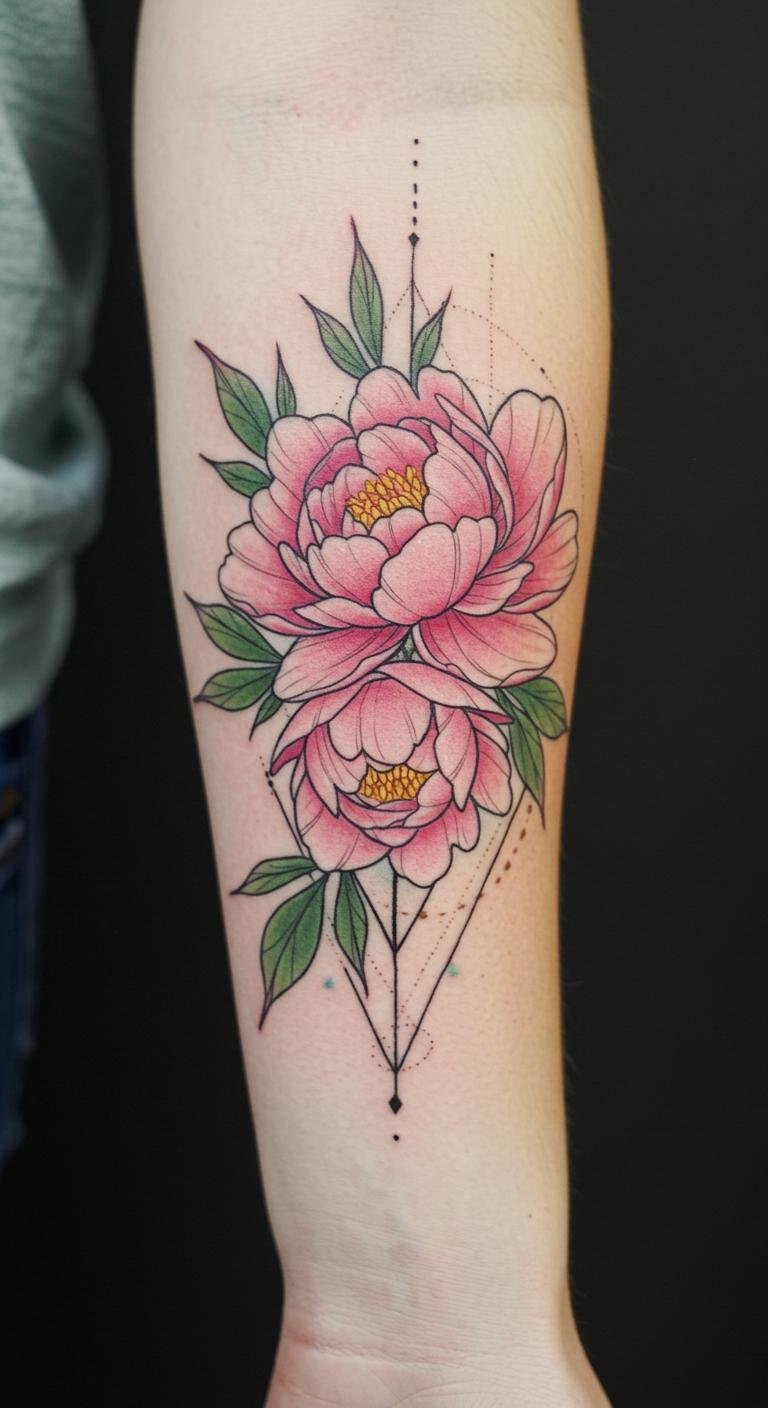This tattoo design symbolizes the harmonious balance between femininity and strength, as represented by the peony’s lush blossoms paired with the boldness of geometric lines.