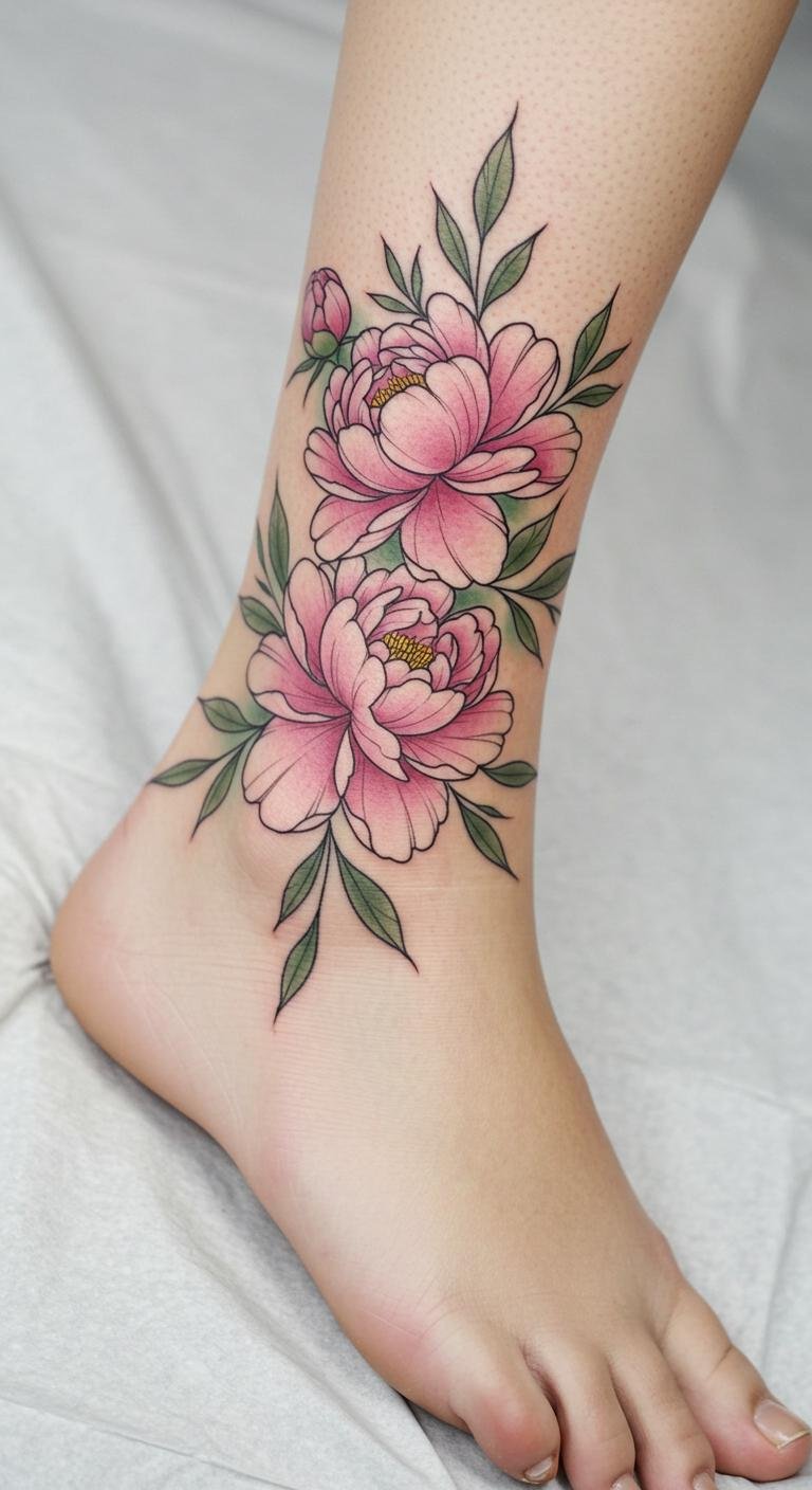 Peonies, known for their lush blooms, represent love and good fortune, making this tattoo not just an artistic expression but a meaningful adornment.