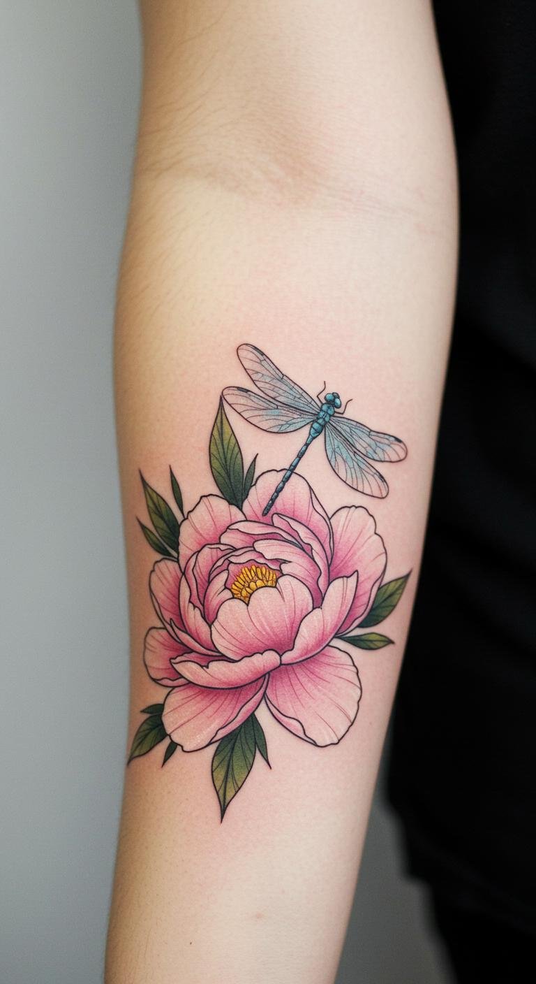 Embodying a spirit of transformation and beauty, this tattoo design symbolizes love through the peony and change through the dragonfly.