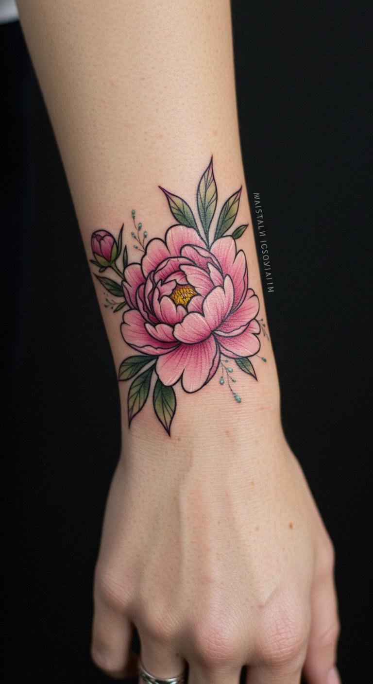 The fine line colored peony tattoo on the wrist symbolizes love and grace, reflecting the wearer’s personality and emotional depth.