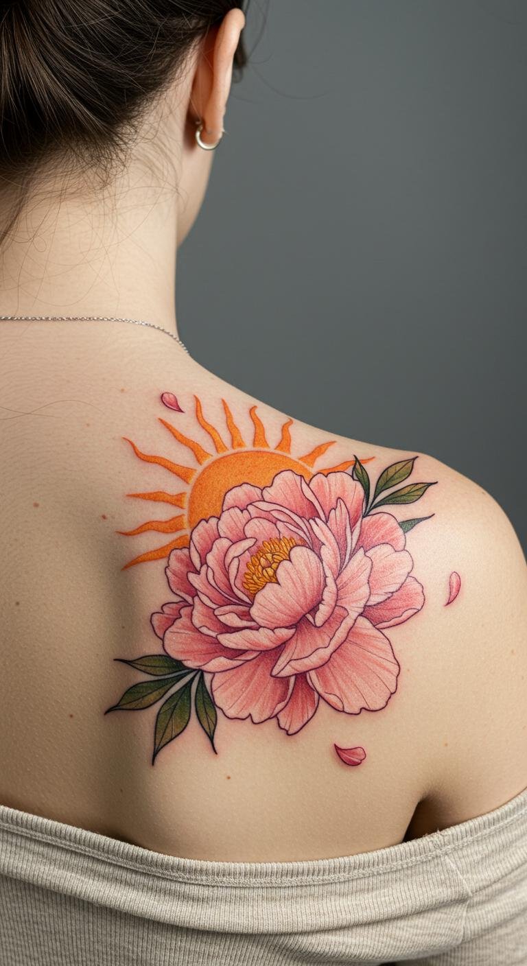 This tattoo symbolizes love and prosperity, drawing from the rich meanings associated with peonies, while the sun represents vitality and warmth.