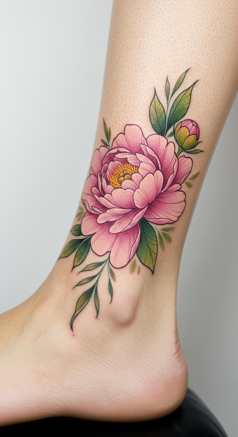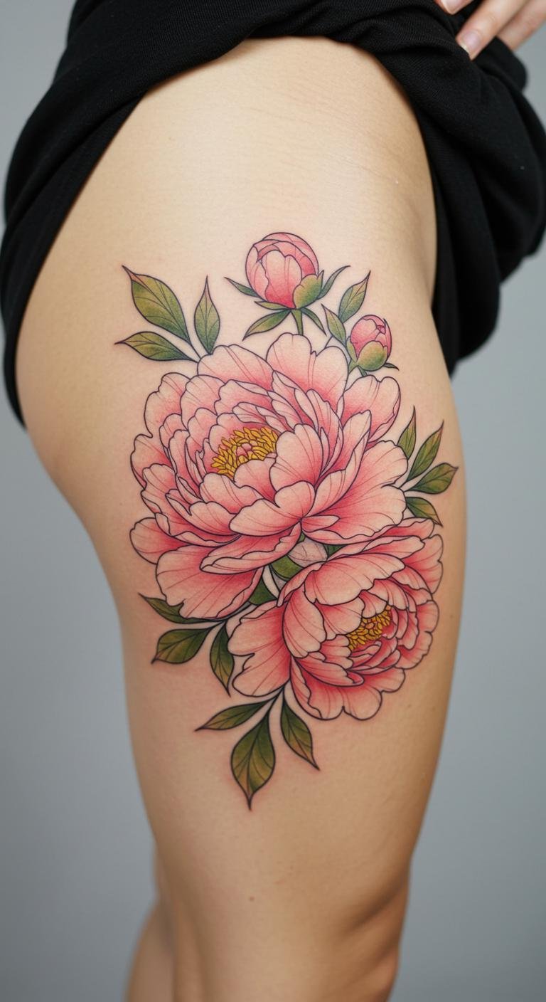 This tattoo design symbolizes love and femininity, capturing the beauty of a peony, which represents romance and prosperity.